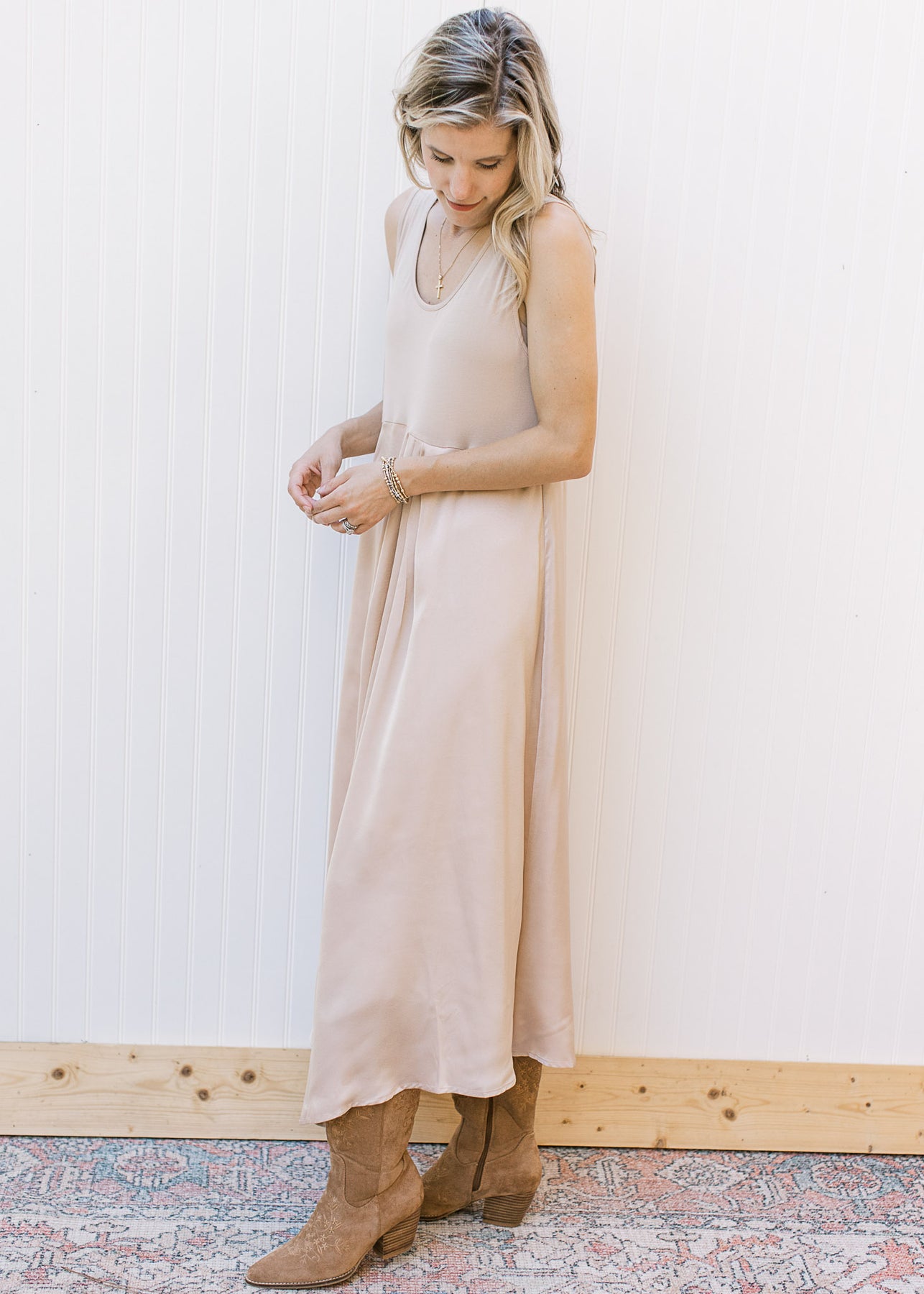 The Champagne Layers Dress is all about timeless sophistication. With its satin finish and soft neutral hue, this sleeveless maxi transitions beautifully from season to season.