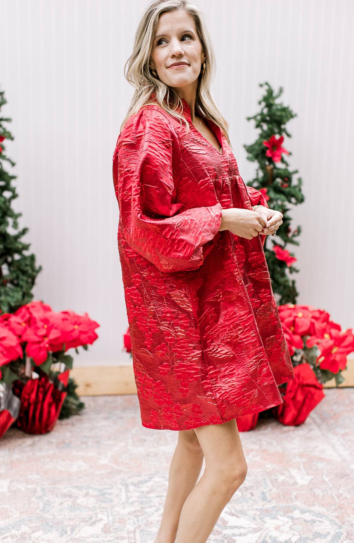 This Red Embossed Dress captures everything we love about festive dressing — with a bright red hue, a little sparkle, and a textured floral. It’s the perfect blend of elegance and fun, making you feel confident and beautiful at every celebration.