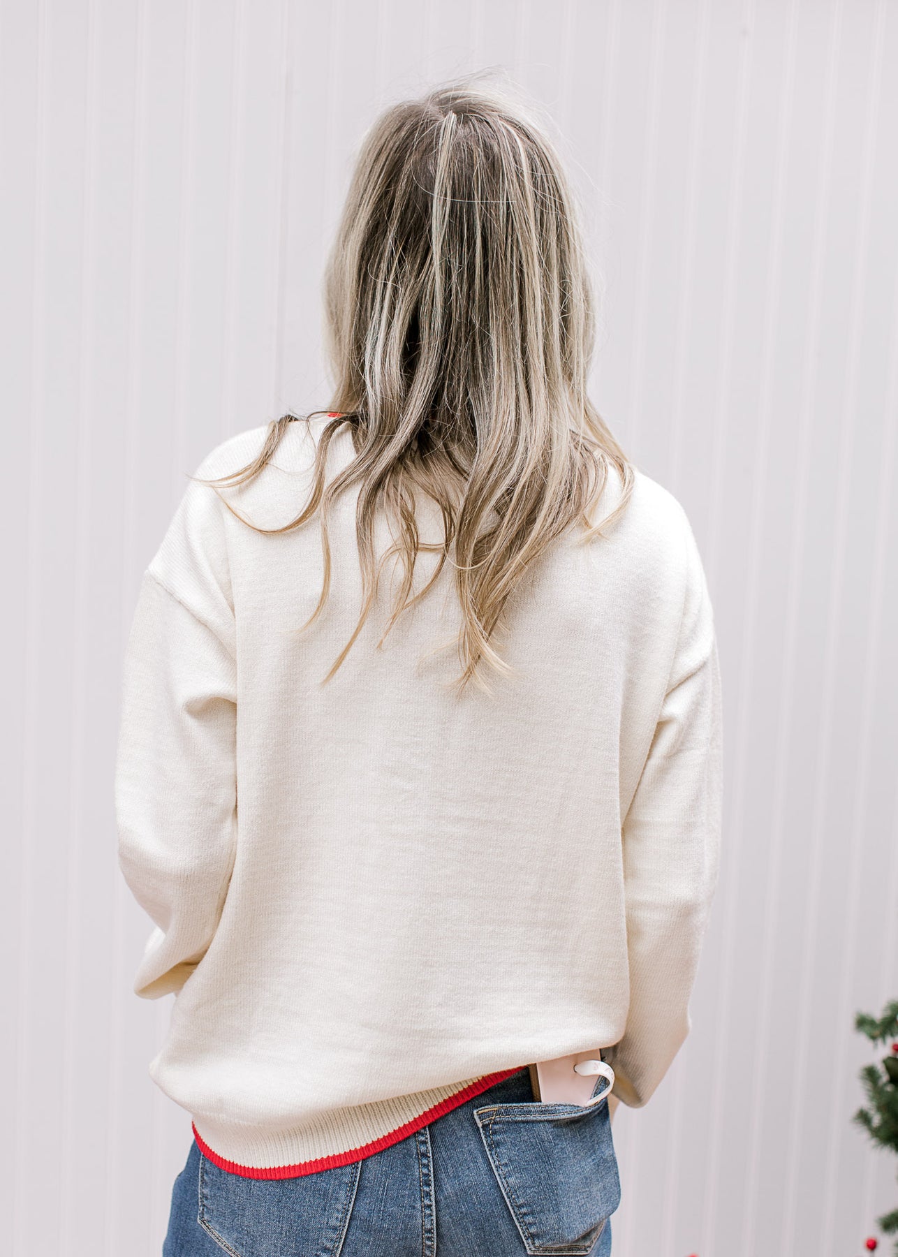 • Cream sweater with Christmas tree graphic, presents, and red velvet bows.