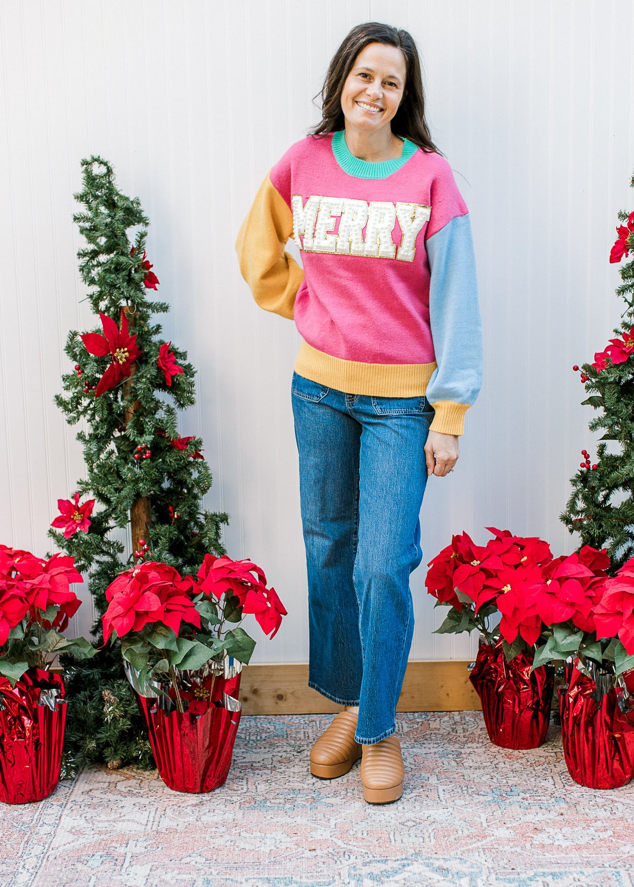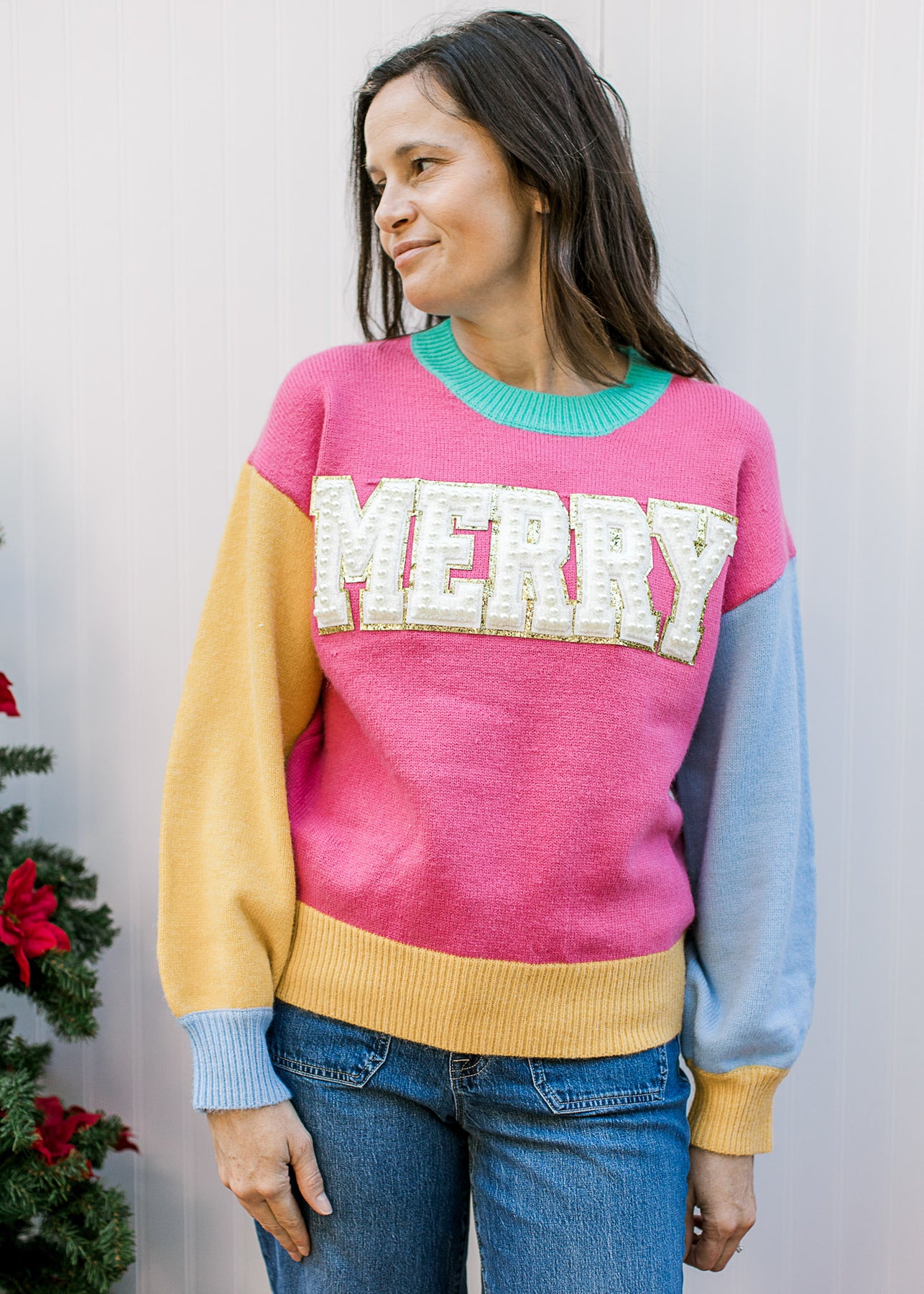 The Merry Pearl Sweater is the ultimate cheerful statement piece for this season. With its playful color blocking and pearl-embellished lettering, it’s made to bring joy and style to your holiday wardrobe.