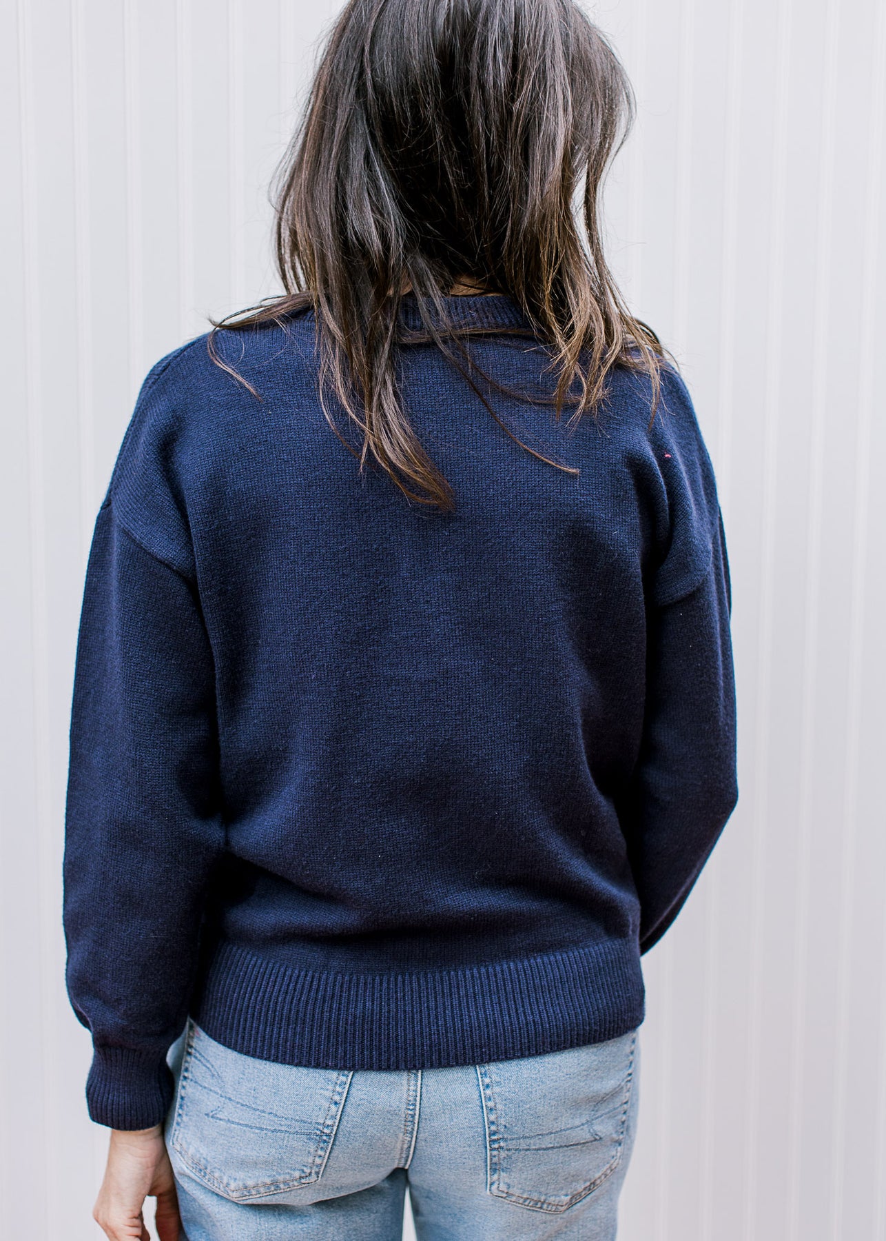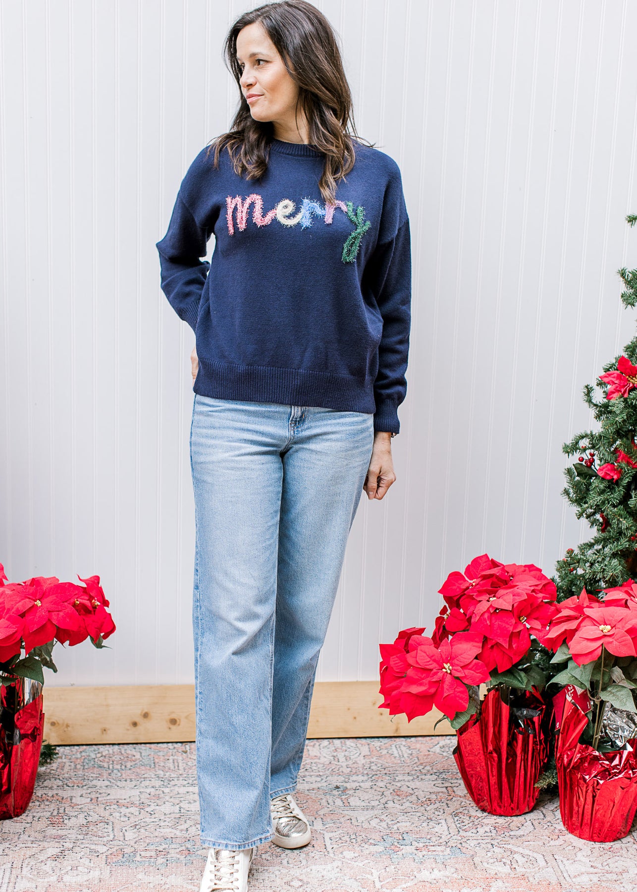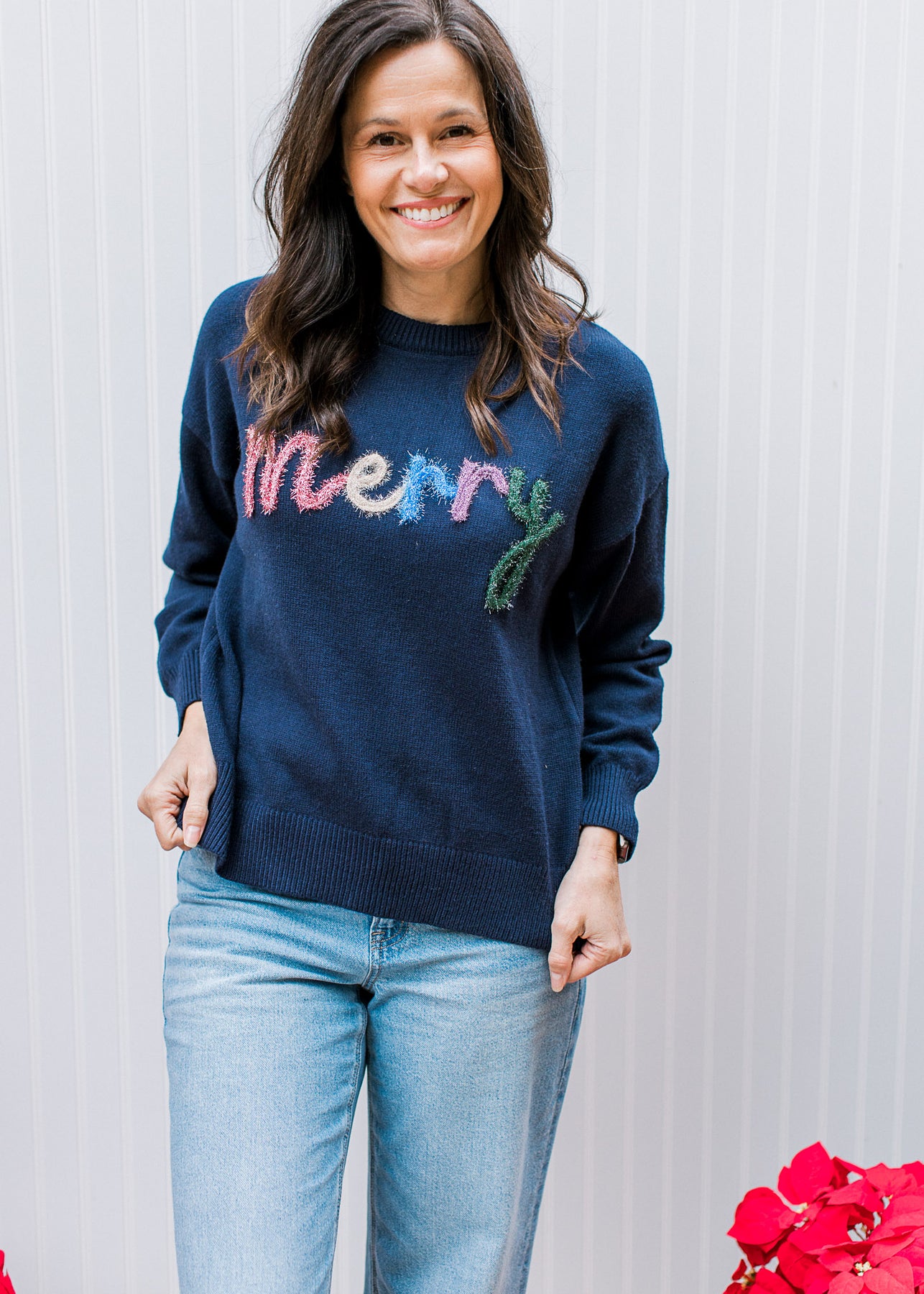 The Navy Merry Sweater adds just the right touch of sparkle to your seasonal style. With its shimmered lettering and luxuriously soft knit, this sweater makes festive dressing effortless and comfortable.