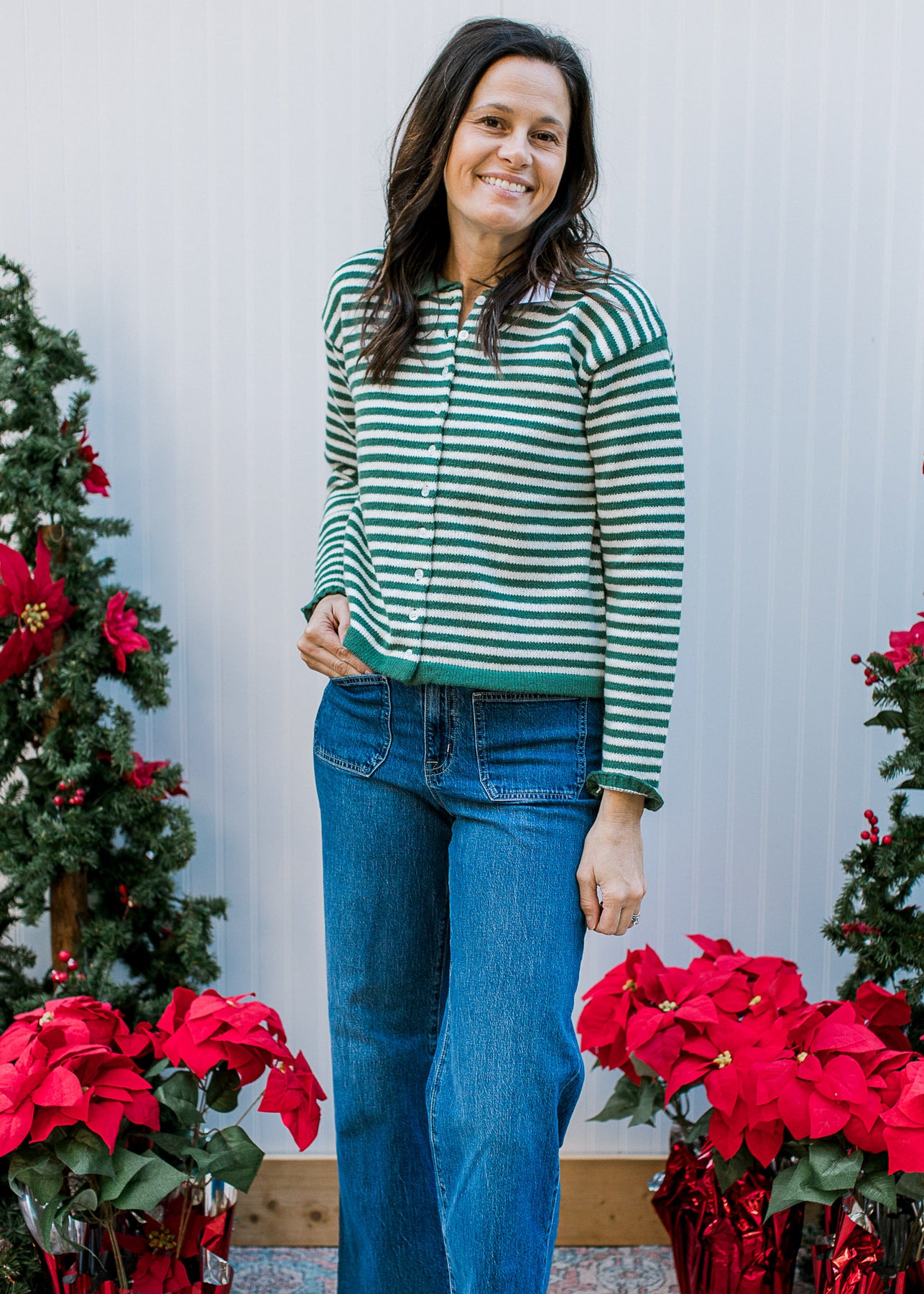 The Olive and Ivory Cardigan brings a touch of charm to everyday style. With soft stripes and delicate knit ruffles, it’s equally perfect worn as a lightweight sweater or layered as a cardigan.