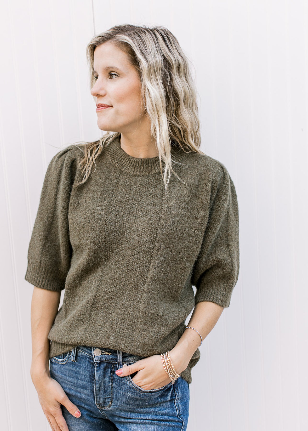 • Olive-colored short sleeve sweater with subtle textured detail.