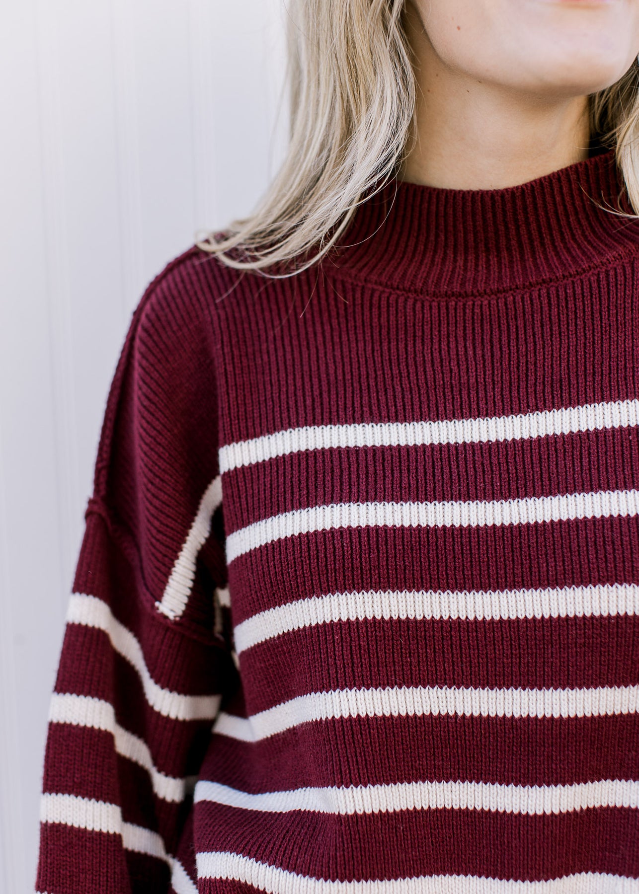 The Burgundy Stripe Sweater brings together cozy comfort and simple chic style with ease. Its warm burgundy hue paired with cream stripes creates a timeless look you can reach for again and again.