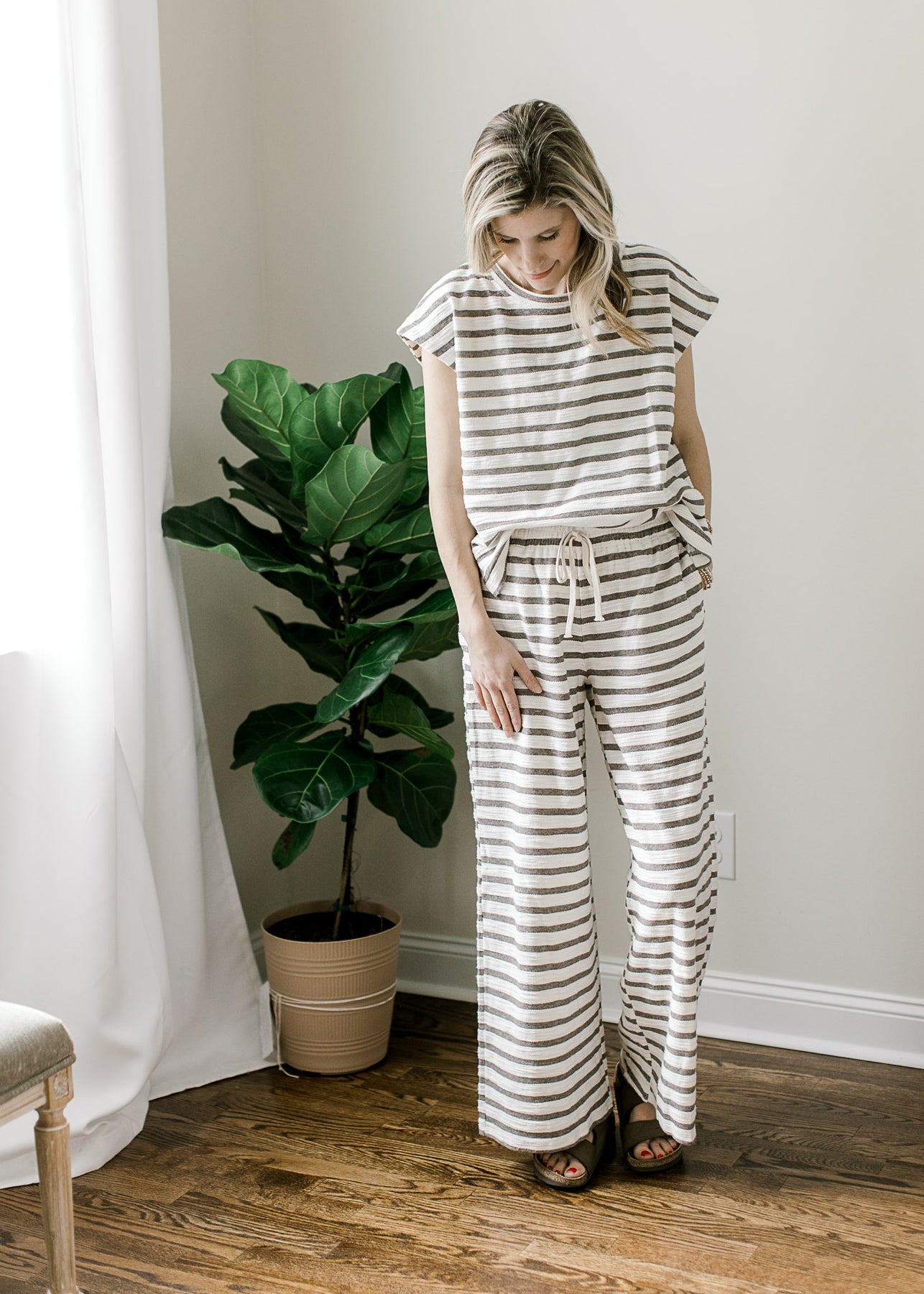 This matching set keeps things simple with a relaxed fit, a lightweight textured fabric that is not sheer, and classic gray and white stripes that feel clean and timeless.