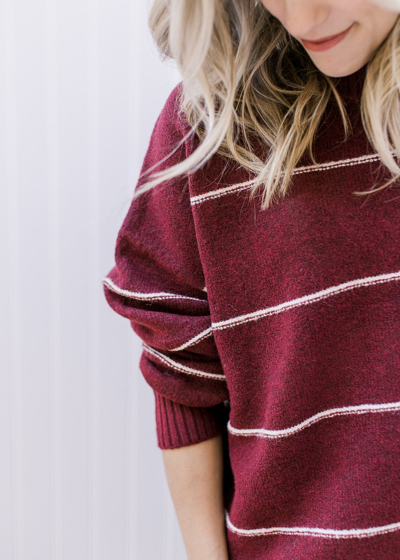 The Red Wood Stripe Sweater combines cozy comfort with timeless style. Its mottled burgundy knit and creamy stripe create a warm, seasonal look you’ll reach for again and again.