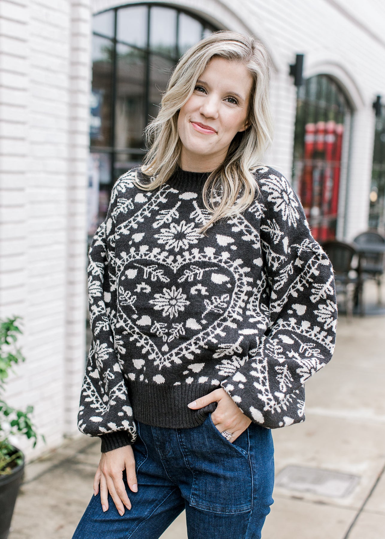 This heavyweight knit features a soft charcoal base accented by a cream heart and snowflake pattern—perfect for adding a touch of warmth and cheer to your cold-weather look. The round neckline and ribbed trim keep it classic, while the relaxed fit makes it easy to wear all season long.