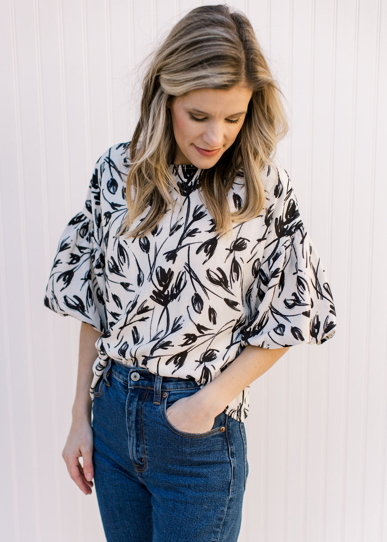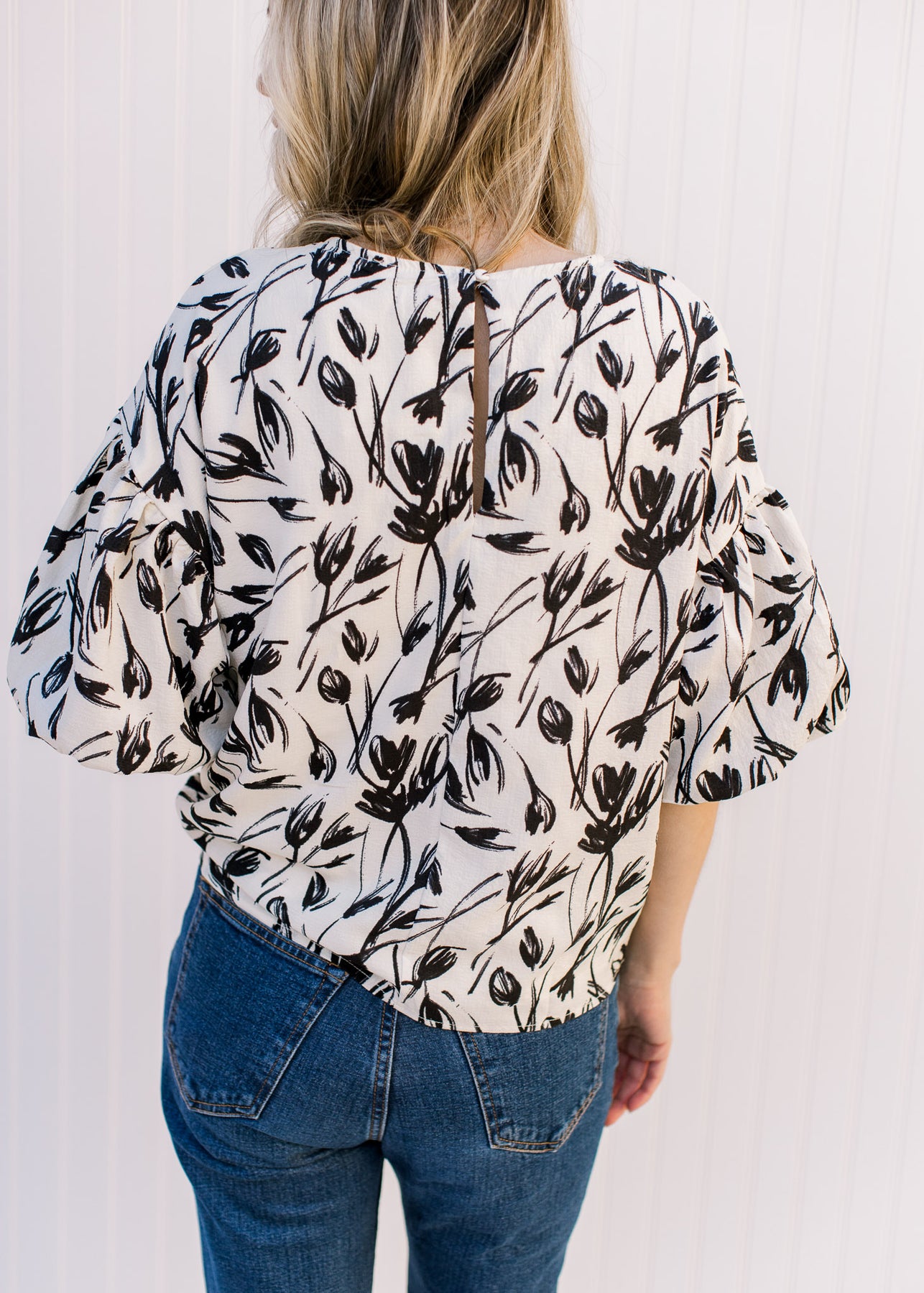This lovely cream and black graphic tulip pattern is so chic. This top has a single button closure, short bubble sleeves, and is fully lined for throw on and look awesome ease.