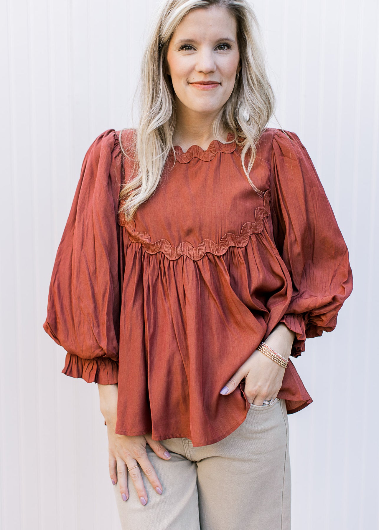 Bring some subtle style to your wardrobe with our Rust Ruffle Top. The 3/4 length sleeves and ric rac details add a unique touch to this versatile blouse. Made from high-quality rust-colored fabric, this top is perfect for any occasion. Add a touch of elegance to your outfit with this must-have piece.