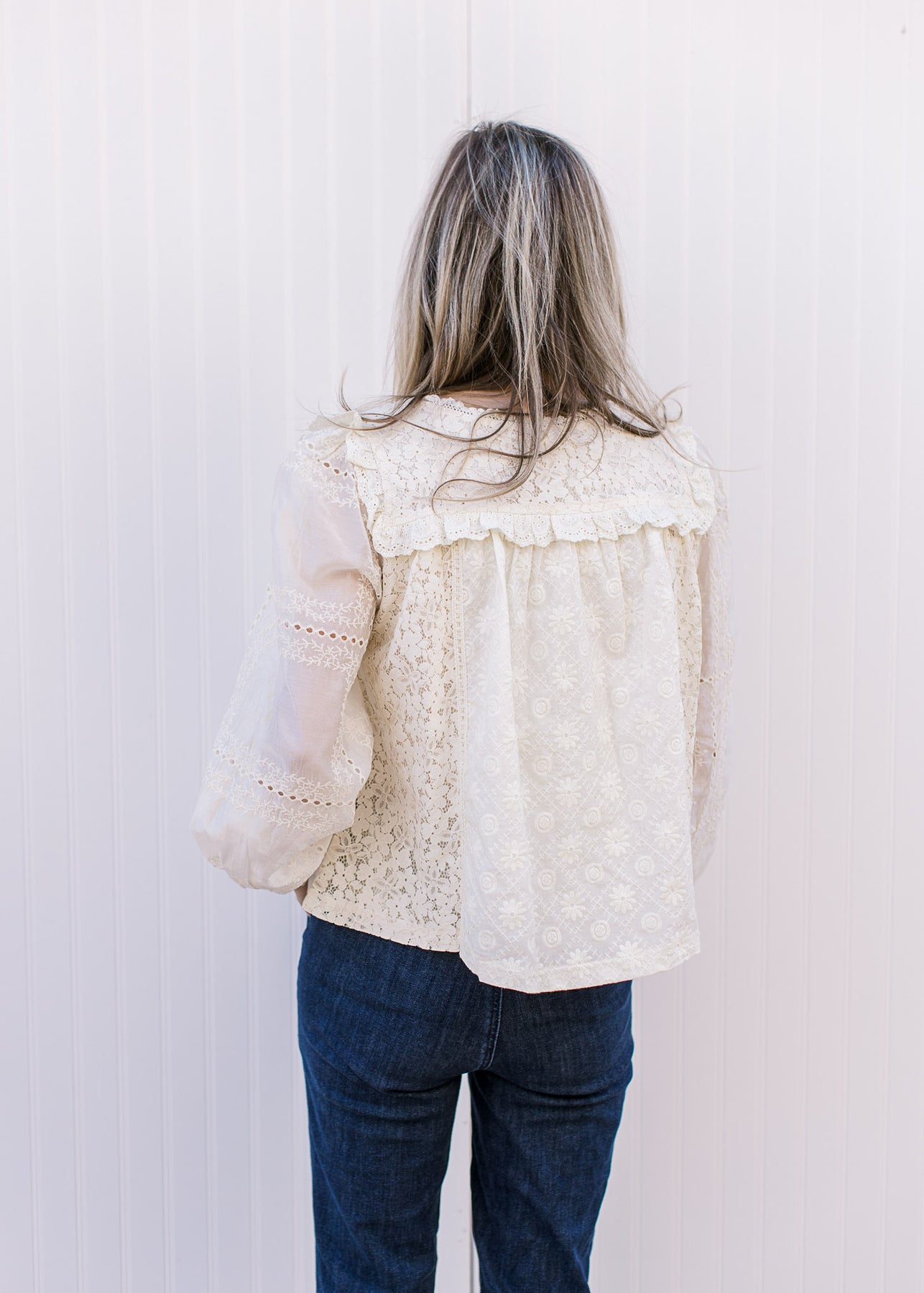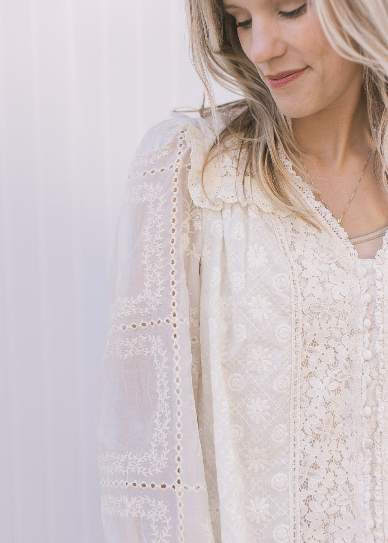 Every element of this blouse feels thoughtful and refined. The mix of lace, embroidery, and sheer sleeves creates a romantic look that transitions seamlessly from daytime plans to evening gatherings—perfect for when you want to feel put together but still completely yourself.