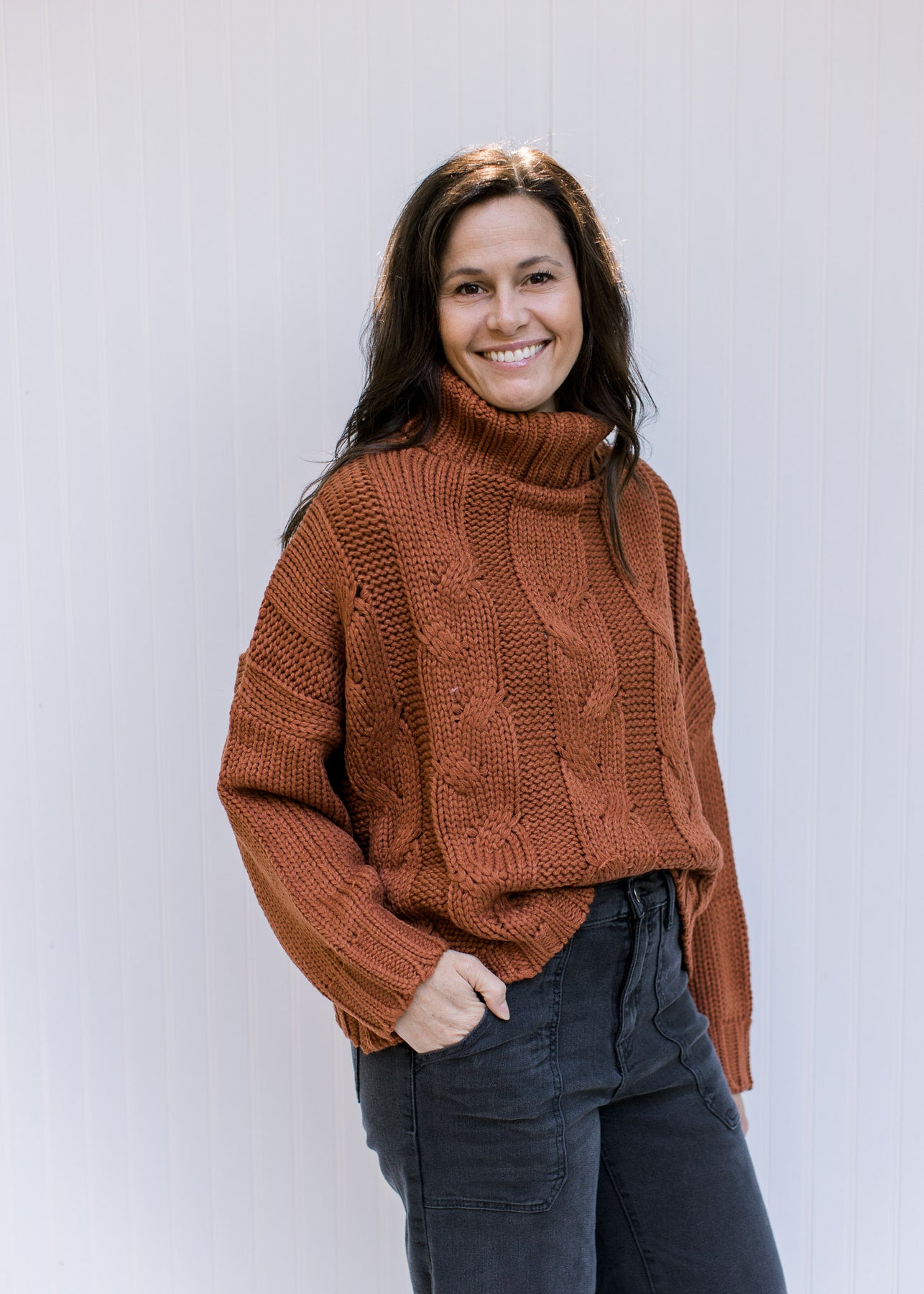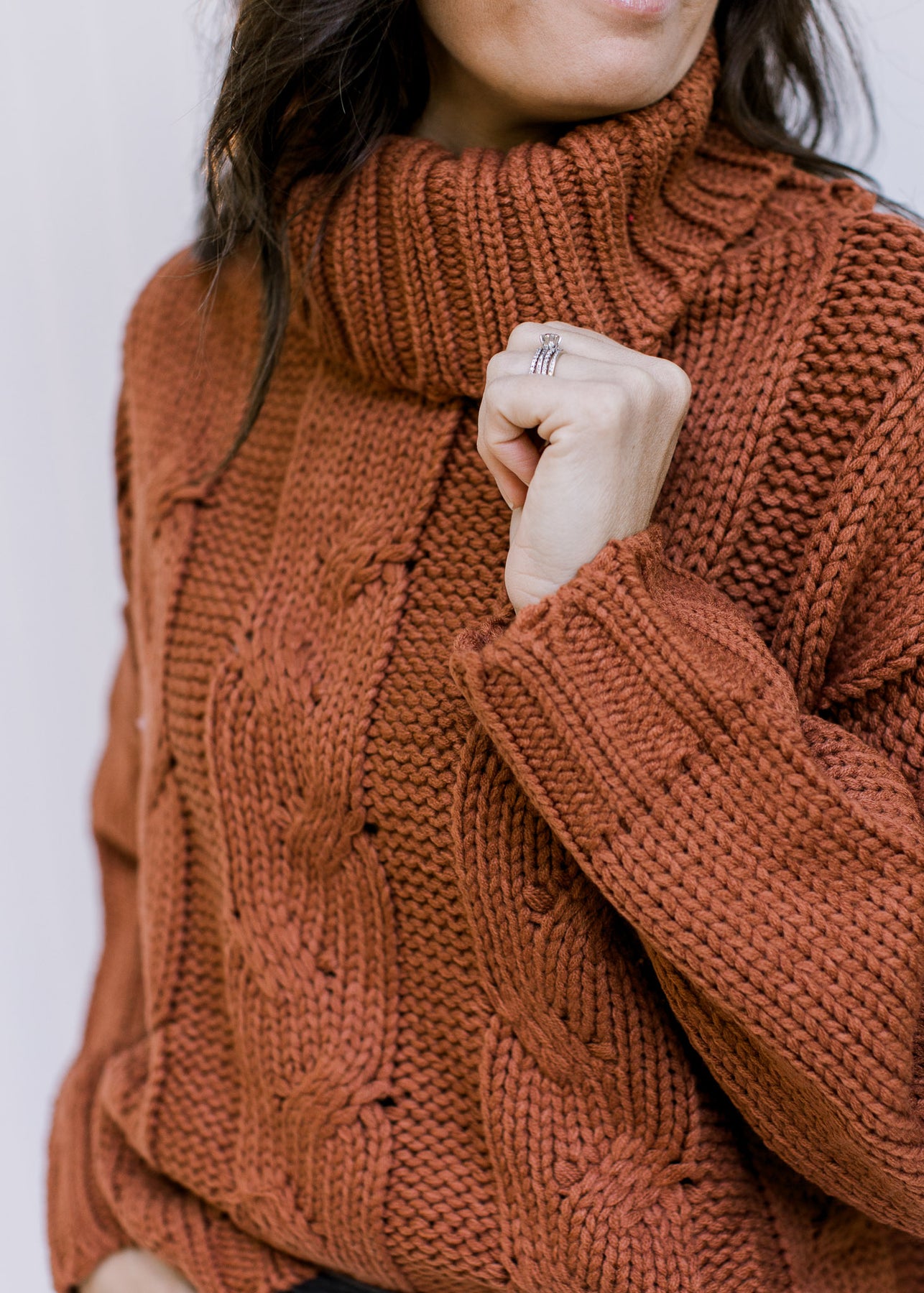 Not only is this piece super cozy, the color is so rich and beautiful. The cropped fit, turtleneck and chunky cable knit all combine to create a chic and fabulous top!